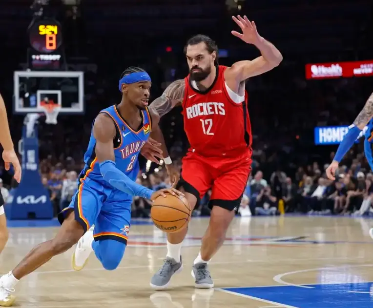 第一节比赛霍姆格伦打成2+1,史密斯内线得分后霍姆格伦抛投得分,尽管之后杜兰特、史密斯和阿门帮助火箭,但霍姆格伦大爆发持续得分,两队也打成平手。暂停后阿门、杜兰特帮助火箭取得领先,但后续雷霆一波6-0完成反超,关键时刻杜兰特罚球得分止血,亚历山大罚球2中1后维金斯命中三分,所幸之后谢泼德也命中三分,卡佩拉内线得分,第一节比赛结束火箭领先3分。第二节比赛霍姆格伦打成2+1,虽然之后奥科吉、申京命中三分,但霍姆格伦等人也给予回应,两队比分非常胶着,后续谢泼德命中三分,亚当斯罚球2中2,火箭领先到4分,虽然后续雷霆追分,但是杜兰特连续得分不说,申京也命中三分,最后时刻米切尔打成3+1,半场比赛结束火箭领先6分。